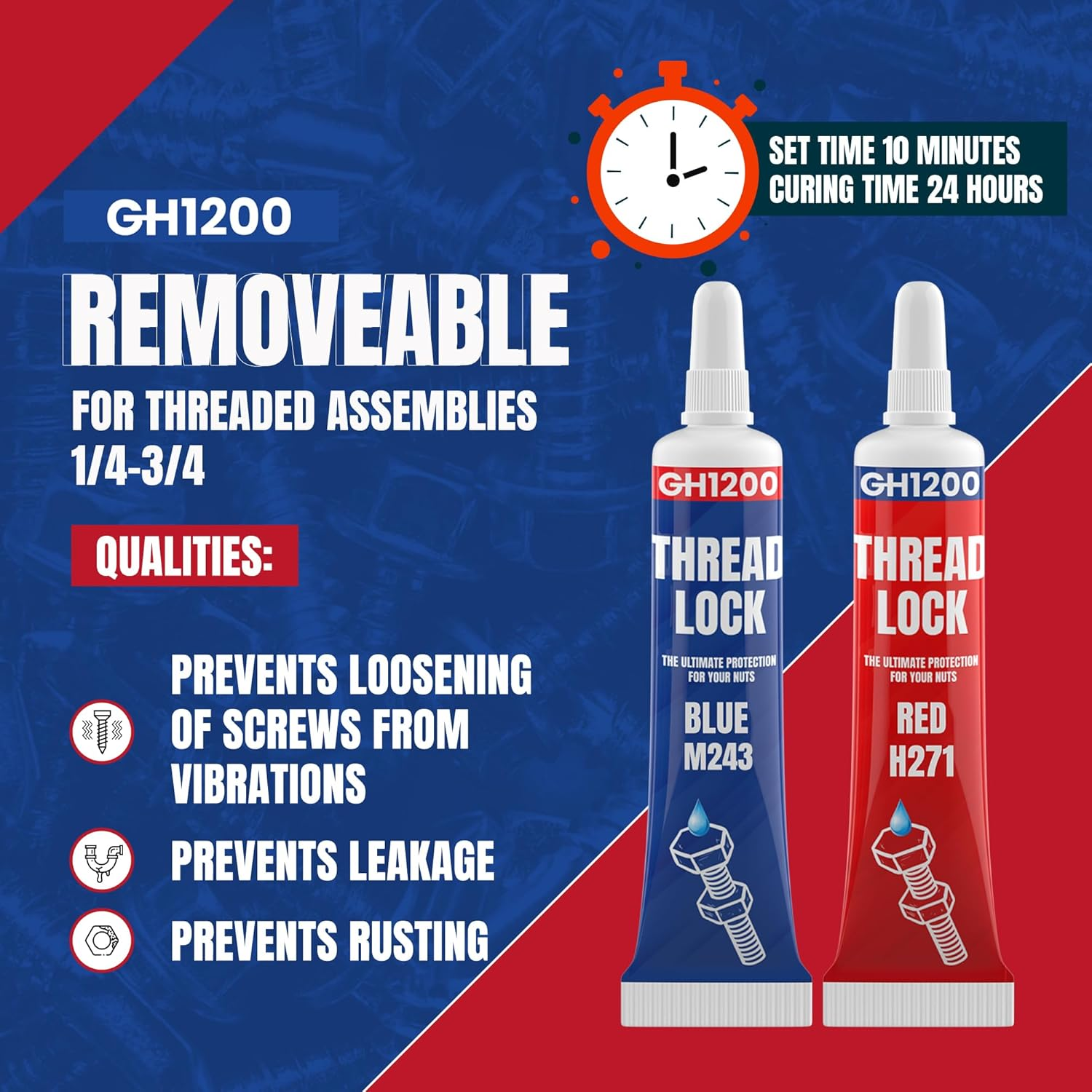 • VERSATILITY YOU CAN COUNT ON: From intricate automotive components to everyday household repairs our liquid thread lock is your one-stop solution for a wide range of applications. The fast-curing formula of thread lock works effectively on all types of fasteners, metals, and threaded connections. GH1200 thread locker automotive is the perfect addition to any toolbox.